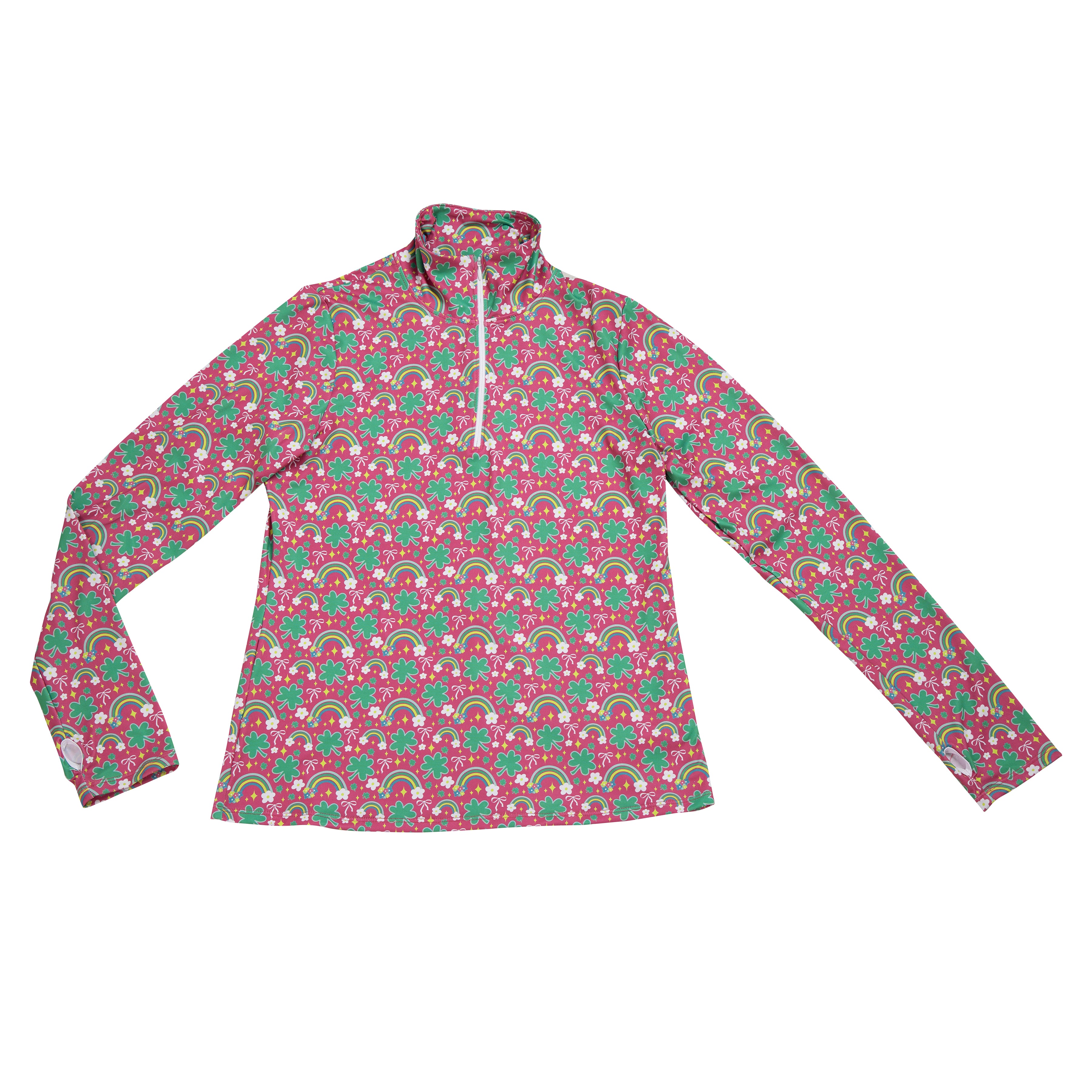 Made from soft, stretchy, moisture wicking fabric, it features a zip mock neck and thumbholes for extra coziness.